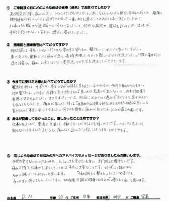 - 腰の不調で上半身、胸の息苦しさまで感じていましたが、施術を受けた後に、胸の変なつかえ感がきれいになくなって背中の痛みや肩、首のはりも気にならなくなっていました。